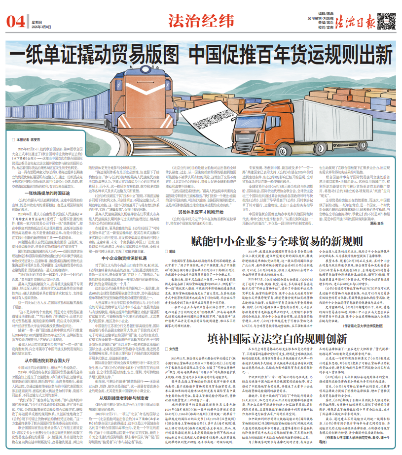 在她看来,更具前瞻性的是,《公约》创设了“可转让货物单证”这一新型运输单证,使其在单式运输和多式联运中均可使用,并发挥类似海运提单的可转让功能。这意味着,未来一个集装箱从中国工厂出发,经铁路运至欧洲港口,再通过海运转运至非洲,全程只需一份可转让单证,实现了双赢多赢共赢。
