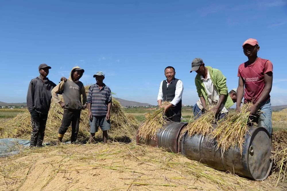 在马达加斯加首都塔那那利佛附近的马义奇镇,中国杂交水稻技术专家胡月舫(右三)在中国国家杂交水稻工程技术研究中心非洲分中心的试验田里和当地农民一起收获水稻(2023年5月12日摄)。新华社发,西塔卡·拉乔纳里松摄