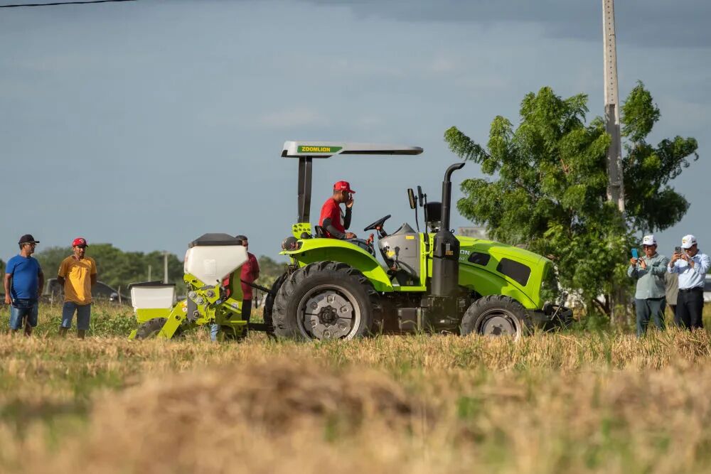 2024年2月2日,在巴西阿波迪,人们观看一款中国生产的农机在田间示范作业。当日,中巴农业机械化合作示范项目启动仪式在巴西阿波迪举行,第一批来自中国7家农机企业共31台(件)设备正式交付给巴西农村劳动者组织。新华社记者王天聪摄