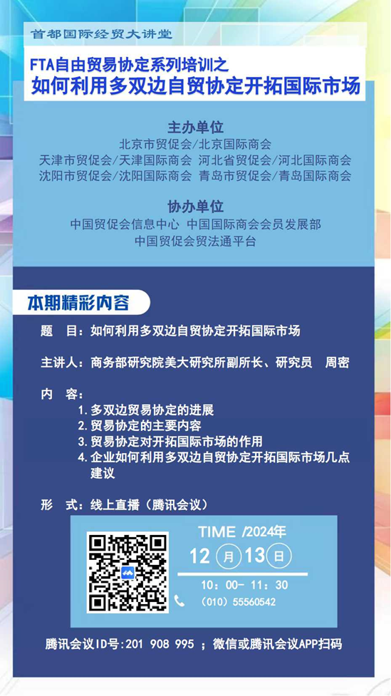 为助力企业高质量“走出去”,有效利用多双边自贸协定开拓海外市场,京、津、冀三地贸促会/国际商会及沈阳市贸促会/国际商会、青岛市贸促会/国际商会将于12月13日(周五)上午10:00共同举办以“如何利用多双边自贸协定开拓国际市场”为主题的讲座。